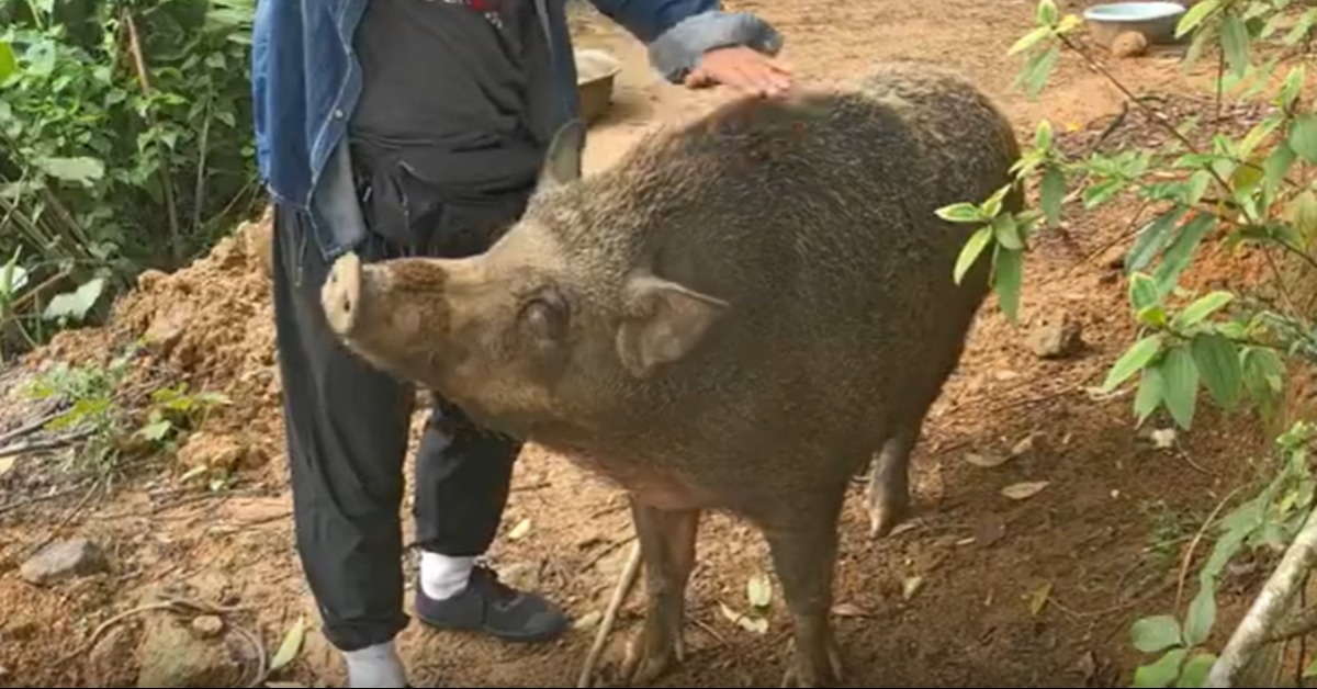 對著山裡大聲呼喚,結果真的有隻野豬從樹林裡緩緩走了出來。他是廣東江門觀音寺的活招牌「豬五妹」,雖然體型龐大,超過150公斤,但有別於其他野豬兇猛充滿攻擊性,豬五妹個性相當溫順,深受香客喜愛。江門觀音寺師父:「阿彌陀佛,阿彌陀佛。」