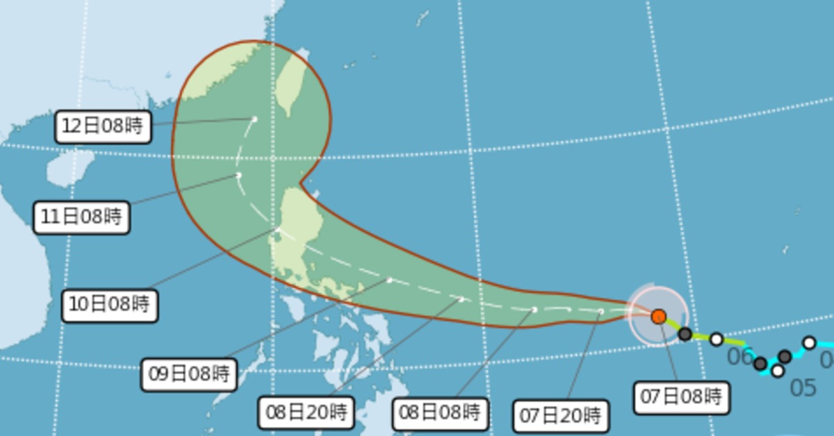 中央氣象署預測11月10日(下週一)上午8時,颱風路徑為中心位置在北緯16.7度,東經120.2度,瞬間最大陣風每秒55公尺;12日則為北緯21.9度,東經119.0度,瞬間最大陣風每秒38公尺。