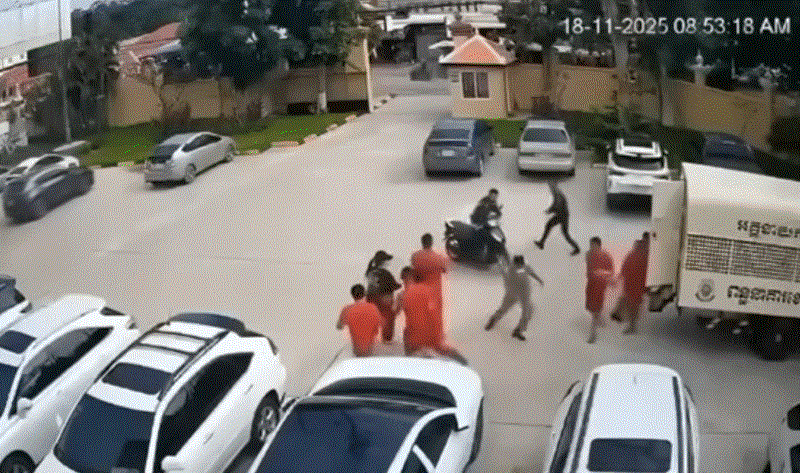 柬埔寨斯雷省法院18日上演一起膽大妄為的白日越獄戲碼。1名遭收押的黑幫老大在法院外突然取得槍枝,當街攻擊獄警後逃離現場,整個過程被監控鏡頭完整捕捉,震驚當地社會。