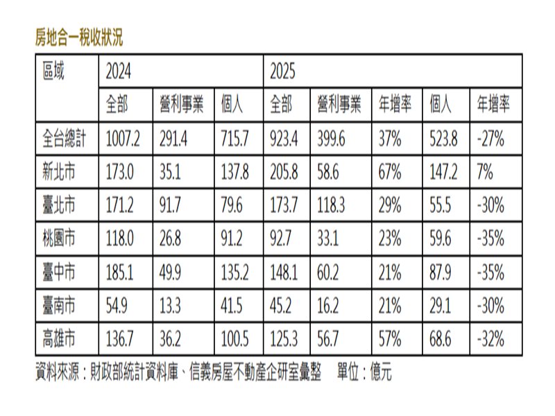 2025受到景氣衝擊,個人房地合一稅收剩下523.8億元,年減27%,不過營利事業的房地合一稅收全年399.6億元年增37%,2025全年的房地合一稅收共計923.4億元,跌破千億元大關。