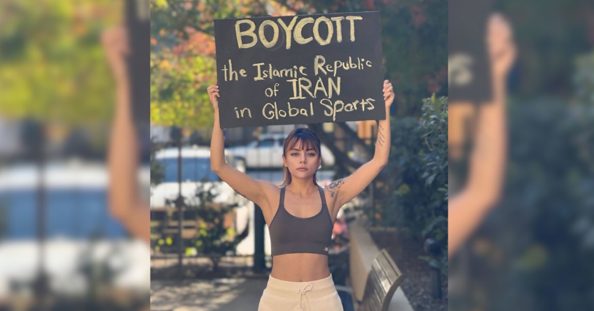曾效力伊朗國家女子五人制足球隊的前國腳席娃.阿米尼(Shiva Amini)只因被拍到在公共場合踢足球時未戴頭巾而被迫叛逃伊朗,她展示了一塊抗議伊朗。(圖/Shiva Amini、CNN)
